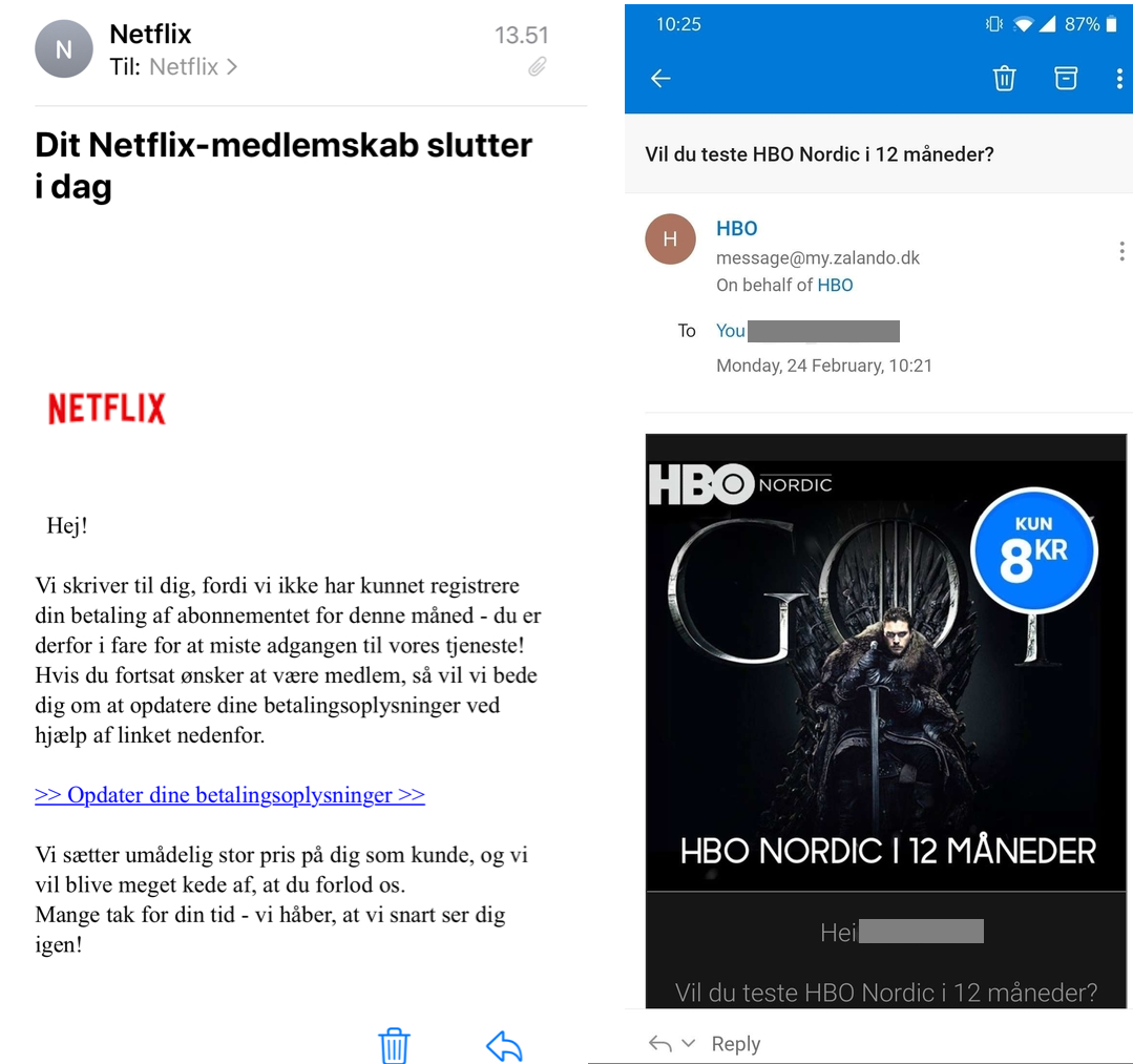 Dette ved svindlerne også godt. Vi modtager en stigende antal tips fra appens brugere, som har modtaget fup-mails fra en streamingtjeneste, særligt HBO Nordic, Viaplay og Netflix.